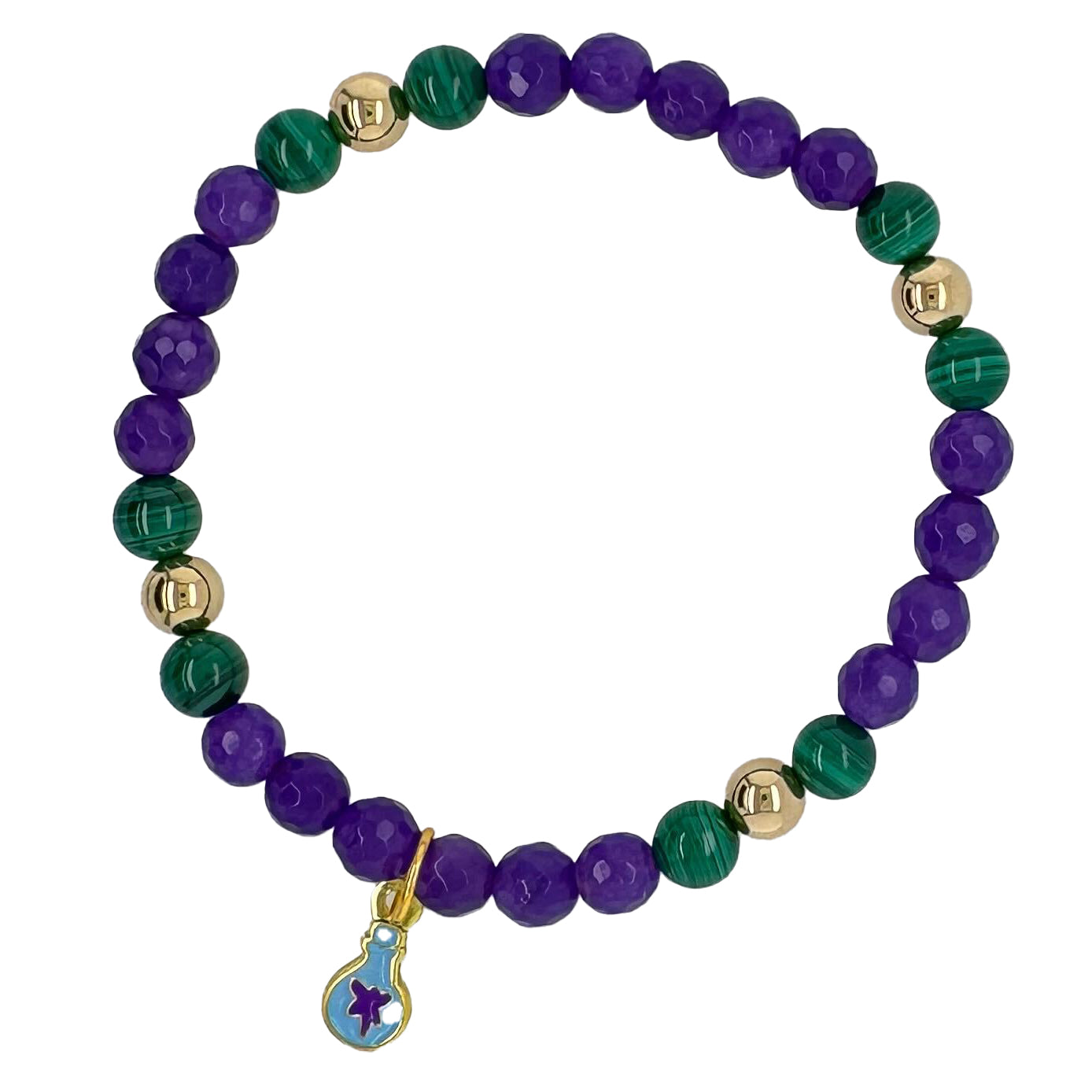 Jewelry Quality Designs: Gemstone bracelets that use gold-filled beads; accented with an enamel, gold-plated brass charm. Each of our four bracelets have a variety of gemstones such as quartzite, agate and malachite.