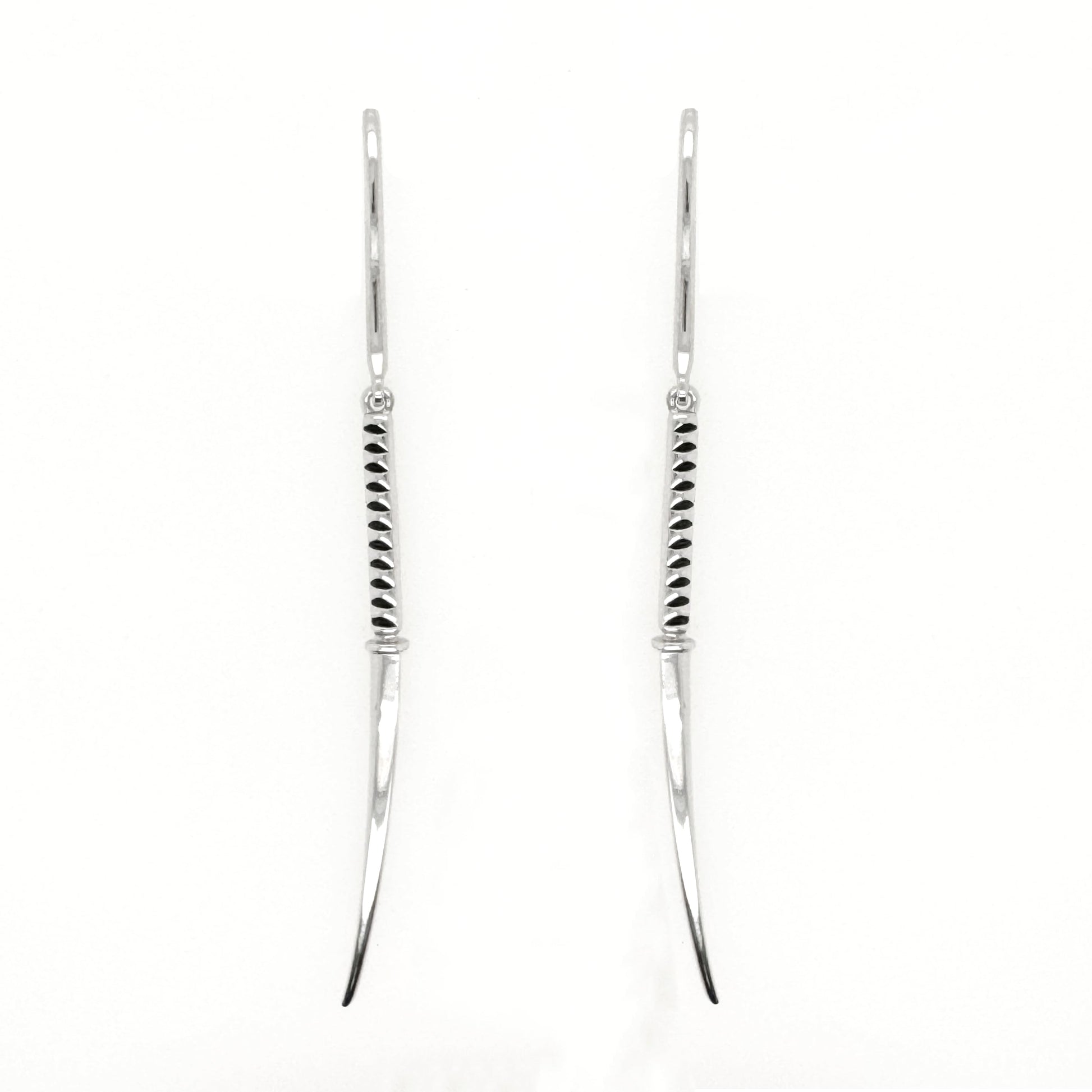 Jewelry Quality Designs: Handcrafted in rhodium-plated, nickel-free, 925 sterling silver and antiqued for contrast, the Katanas measures 50mm in length plus the ear wires.