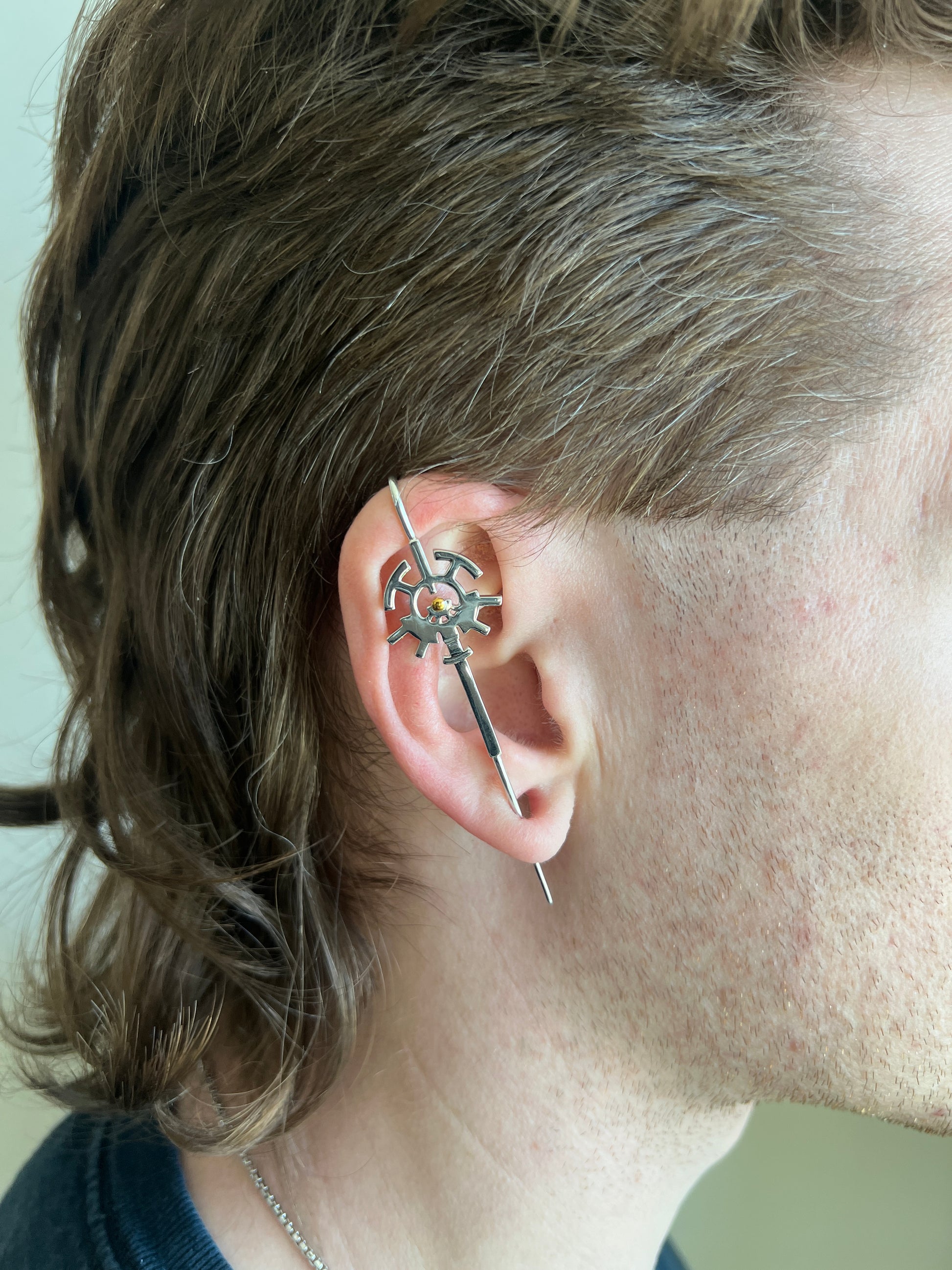 Jewelry Quality Designs: Handcrafted Sterling Silver earring with rhodium and 14kt plating. Has a hook that will sit on the top of the ear. Size of the earring is 74x20mm and is sold as a single large earring.