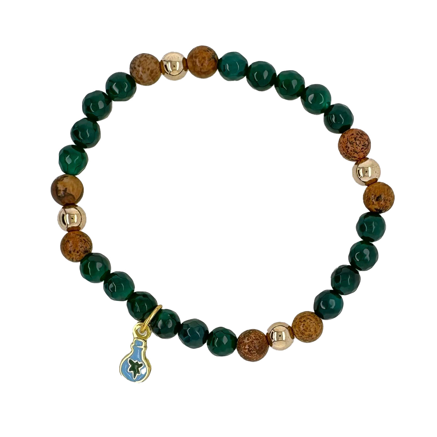Jewelry Quality Designs: Gemstone bracelets that use gold-filled beads; accented with an enamel, gold-plated brass charm. Each of our four bracelets have a variety of gemstones such as quartzite, agate and malachite.