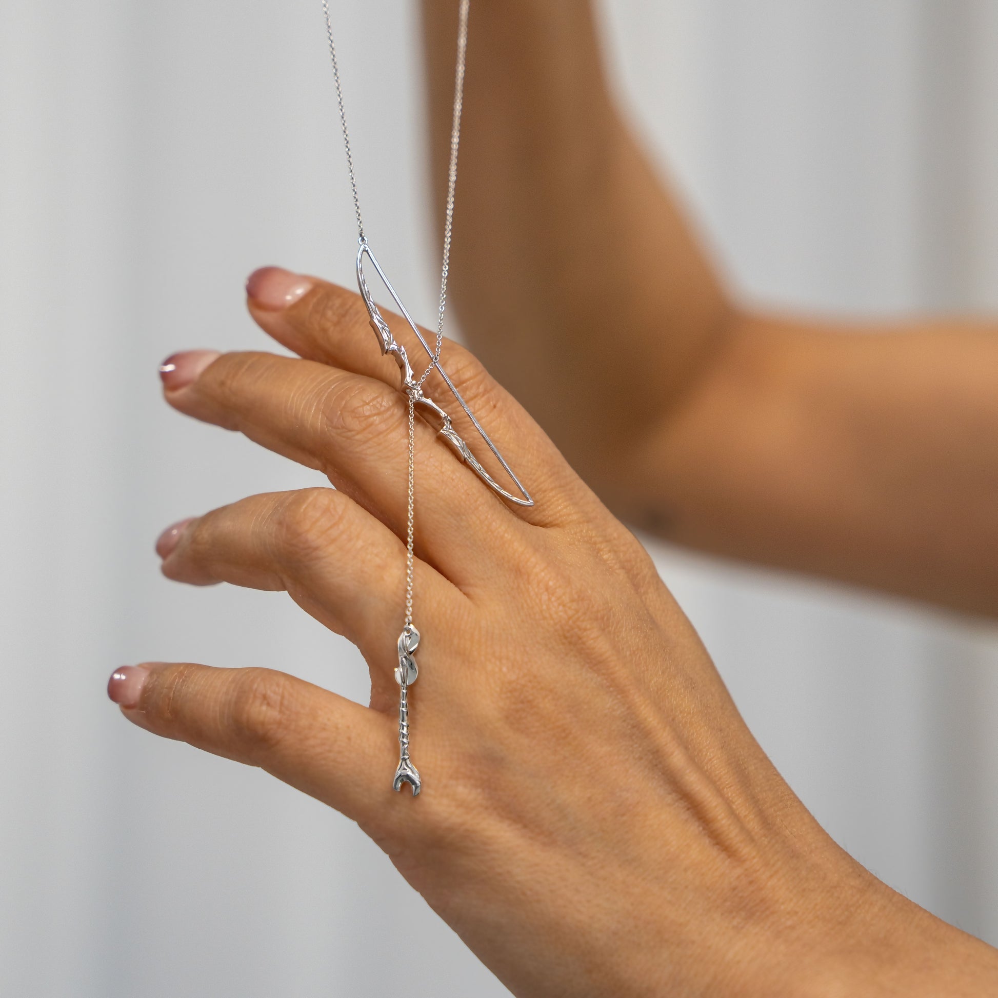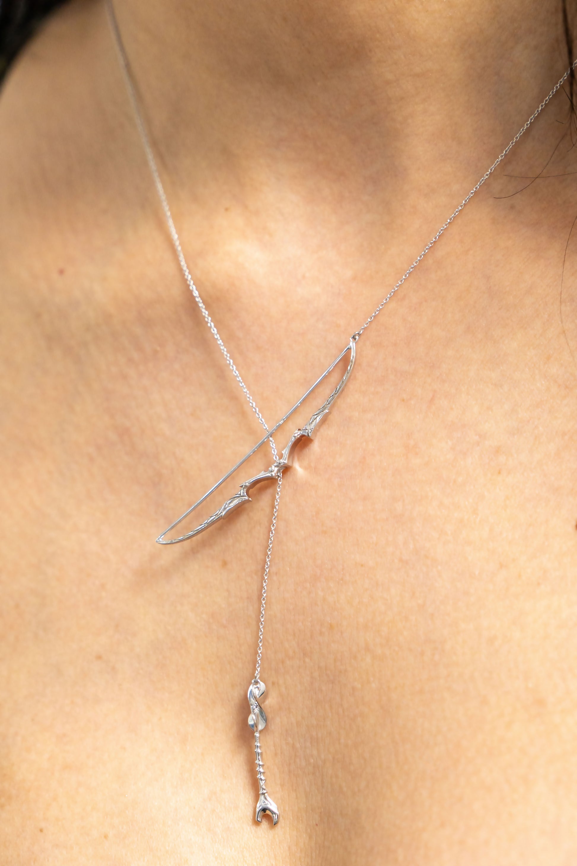 Jewelry Quality Designs: Rhodium-Plated, Nickel-Free, 925 Sterling Silver with chain Attached. Bow is 60mm across, with a arrow that is 30mm.